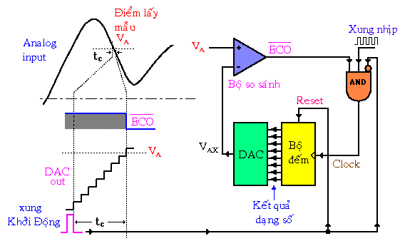 Tiến trình cứ tiếp tục cho đến khi VAX lên đến bậc vượt quá VA một khoảng VT tại thời điểm này ngõ ra của bộ so sánh EOC về thấp và cấm không cho xung nhịp đi vào bộ đếm nên bộ đếm sẽ ngừng đếm. Tiến trình chuyển đổi hoàn tất khi tín hiệu EOC chuyển từ trạng thái cao xuống thấp và nội dung của bộ đếm là biểu thị dạng số của điện áp tương tự vào VA.