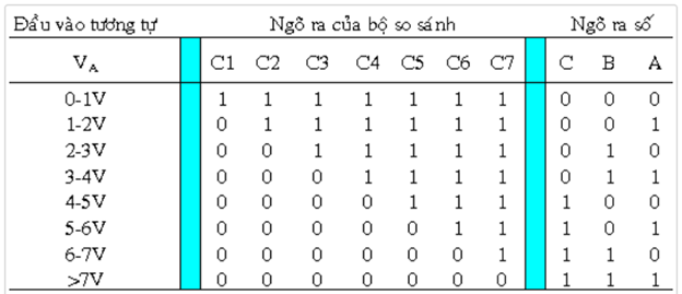 Với VA < 1V thì tất cả đầu ra của bộ so sánh đều lên mức cao. Với VA > 1V thì từ một đầu ra trở lên sẽ xuống mức thấp. Đầu ra của bộ so sánh được đưa vào bộ mã hoá ưu tiên tích cực ở mức thấp, sinh đầu ra ứng với đầu ra có số thứ tự cao nhất ở mức thấp của bộ so sánh. Bảng giá trị như bảng sau:
