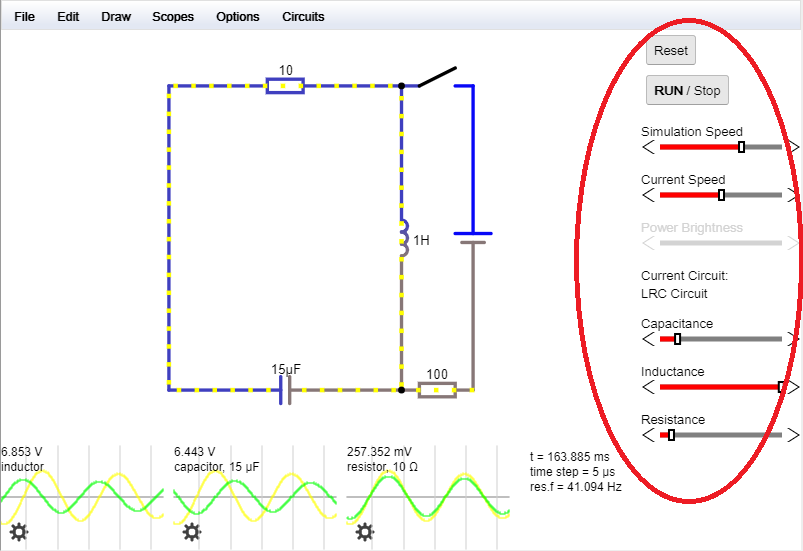 Ngay lập tức sẽ xuất hiện giao diện ban đầu của phần mềm đó là mạch RLC với hiệu ứng dòng điện trên các nhánh và đồ thị thời gian của dòng điện và điện áp trên các phần tử: