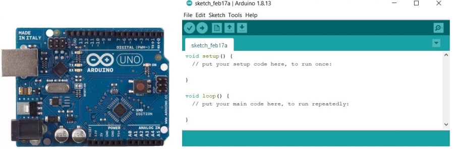 Hình 1. Board Aruino và giao diện phần mềm lập trình Arduino IDE