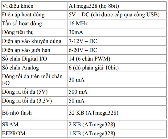 Một số thông số kỹ thuật của Arduino UNO R3 như sau: