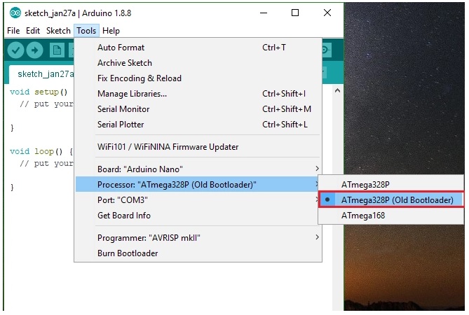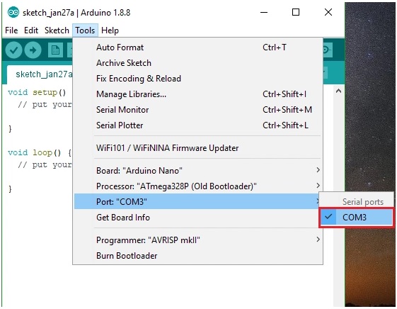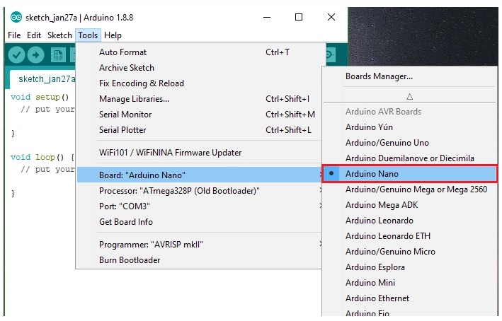 Vào Tool chọn Board mà chúng ta cần sử dụng. Ví dụ, Arduino Nano.