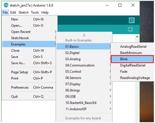 Sau khi đã thiết lập xong, tiến hành nạp chương trình : Ví dụ chọn chương trình điều khiển đèn LED nhấp nháy trong File/Examples/Basics/Blink.