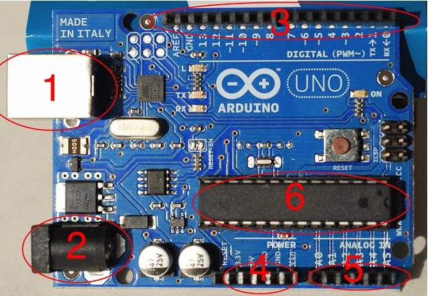 Một số thành phần của Arduino UNO R3 được đánh số trên hình 2 có chức năng như sau: