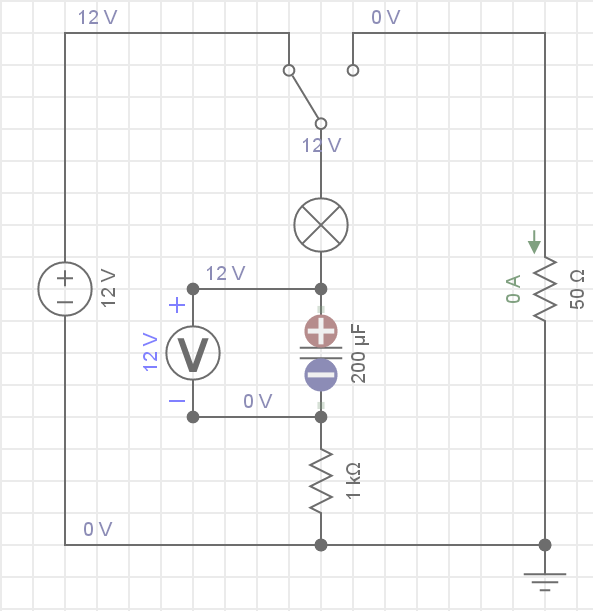 Đưa khóa K về bên phải, quan sát sự dịch chuyển của dòng điện trong mạch, đồng thời quan sát sự biến thiên giá trị điện áp và dòng điện trên đồ thị đến khi tụ xả hết (không có sự dịch chuyển của các hạt tải điện)