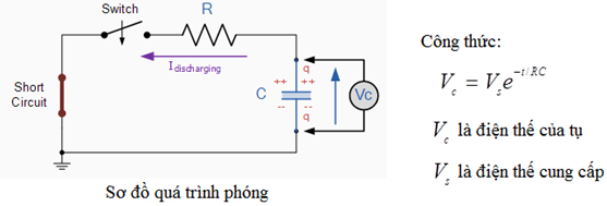 Qúa trình tụ phóng điện: Khi tụ đã nạp đầy, nếu công tắc K1 mở, công tắc K2 đóng thì dòng điện từ cực dương (+) của tụ phóng qua bóng đền về cực âm (-) làm bóng đèn loé sáng, khi tụ phóng hết điện thì bóng đèn tắt.