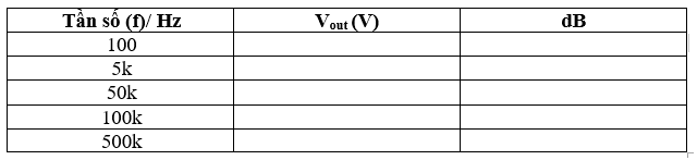 Bước 4: Tính tần số cắt với các giá trị ở sơ đồ (phần 2). Tính toán độ suy hao tín hiệu theo dB (áp dụng công thức dB = 20lg(Vout/Vin/fHz )? Ghi giá trị vào bảng sau:
