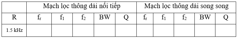 Bước 4: Với các tham số trên sơ đồ mạch lọc thông dải nối tiếp (phần 2) và mạch lọc thông dải song song (phần 2) hãy tính toán và đưa ra giá trị tần số trung tâm fr và các tần số cắt f1 và f2 ? Ghi giá trị vào bảng sau: