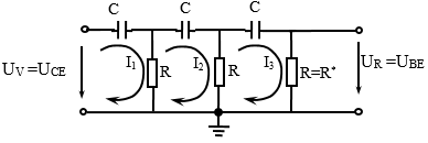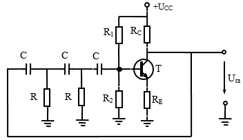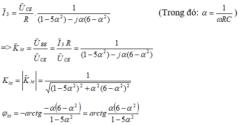 Từ (2) ta thấy, mỗi mắt lọc thông cao RC gây nên sự di pha tín hiệu jRC< 900 khi R, C khác không. Để thực hiện di pha 1800 thì khâu hồi tiếp phải có ít nhất là 3 khâu RC, mỗi khâu di pha tín hiệu một góc jRC= 600. Có thể dùng các khâu RC có trị số khác nhau, tuy nhiên để đơn giản ta dùng 3 khâu RC có trị số như nhau. Muốn vậy các điện trở trong sơ đồ mạch điện phải thoả mãn điều kiện sau: R*= R1//R2//(rBE+RE) = R.