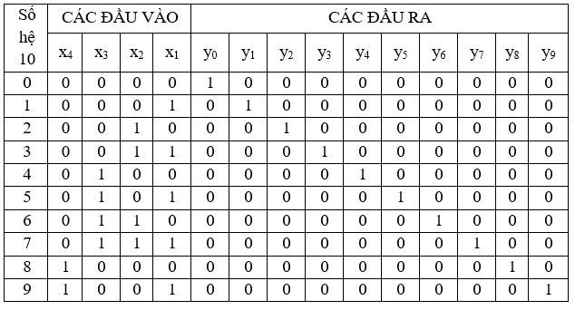 Bảng trạng thái của mạch giải mã thập phân 4:10 như sau: