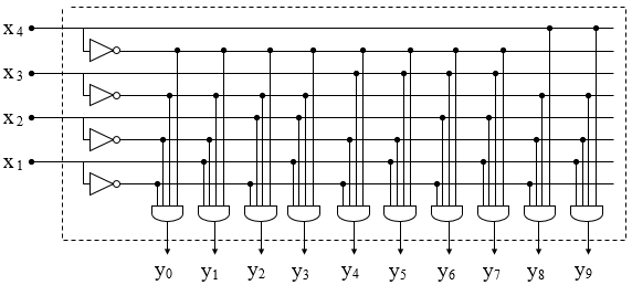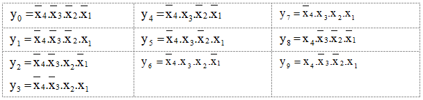 Sơ đồ logic mạch giải mã thập phân 4:10 xây dựng từ các phương trình hàm ra: