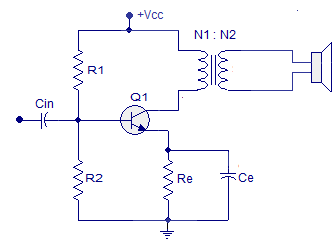 Sơ đồ mạch khuếch đại công suất loại A dùng biến áp trình bày ở hình vẽ dưới đây. Trong mạch các linh kiện làm nhiệm vụ tương tự với các mạch khuếch đại tín hiệu nhỏ, riêng biến áp làm nhiệm vụ ghép tín hiệu ra tải.