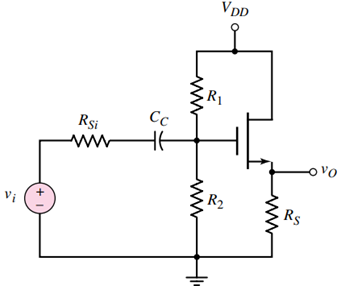 Tín hiệu ra được lấy từ cực nguồn (S) và cực máng D được nối trực tiếp với nguồn cung cấp 1 chiều UDD , trong mạch điện trở R1 và R2 đóng vai trò cầu phần áp, cung cấp điện áp cho cực G của Mosfet. Tín hiệu nhỏ được đưa đến cực G thông qua tụ điện CC.