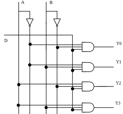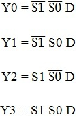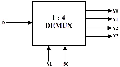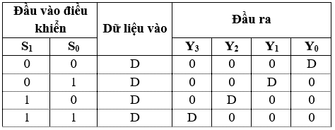 Mạch phân kênh 1:4 có 1 đầu vào dữ liệu D, 2 đầu vào điều khiển S0, S1 và 4 đầu ra Y0, Y1, Y2, Y3. Dữ liệu vào D được đưa ra ở đầu ra nào phụ thuộc vào tổ hợp bit của 2 đầu vào điều khiển. Ví dụ, khi tổ hợp bit đầu vào điều khiển (S0, S1) = (0,0) thì dữ liệu D sẽ được đưa ra ở đầu ra Y0, các đầu ra còn lại không có tín hiệu. Bảng trạng thái của mạch như sau: