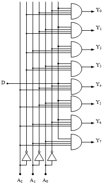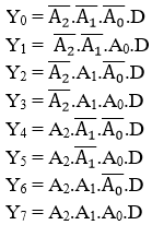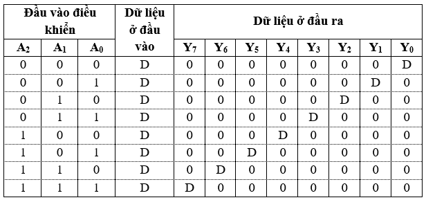 Dữ liệu D được đưa ra ở đầu ra nào phụ thuộc vào tổ hợp bit của 3 đầu vào điều khiển, cụ thể được thể hiện ở bảng trạng thái sau:
