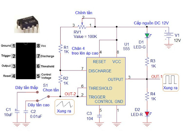 Xung ra lấy trên chân số 3. Khi chân 3 ở mức áp thấp, 0V, thì Led xanh D1 sáng và khi chân 3 ở mức áp cao gần bằng 12V thì Led đỏ D2 sáng. Điện trở R3, R4 dùng để hạn dòng làm việc của các Led. Xung ra trên chân 3 là dạng xung vuông với bờ lên và bờ xuống rất thẳng, dùng dạng xung này kích thích các mạch số là rất tốt.