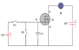 + Khi công tắc K2 đóng, điện áp tích trên tụ C1 giảm bằng 0 => UGS= 0V => đèn tắt.