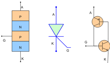 Thyristor có cấu tạo gồm 4 lớp bán dẫn ghép lại tạo thành hai Transistor mắc nối tiếp, một Transistor thuận và một Transistor ngược. Thyristor là Diode có điều khiển , bình thường khi được phân cực thuận, Thyristor chưa dẫn điện, khi có một điện áp kích vào chân G => Thyristor dẫn cho đến khi điện áp đảo chiều hoặc cắt điện áp nguồn Thyristor mới ngưng dẫn.