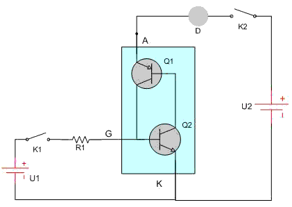 Khi công tắc K1 đóng, điện áp U1 cấp vào chân G làm đèn Q2 dẫn => kéo theo đèn Q1 dẫn => dòng điện từ nguồn U2 đi qua Thyristor làm đèn sáng.