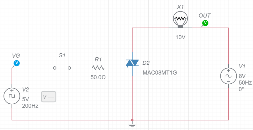 Sơ đồ trên mô tả cách thức điều khiển một bóng đèn sợi đốt. Một nguồn điện lưới xoay chiều được mắc nối tiếp với bóng thông qua một Triac. Rất dễ để nhìn ra là cực A1 của Triac được đấu trực tiếp với một cực của nguồn, cực A2 của Triac được đấu với một cực của bóng và cực còn lại của bóng được đấu với cực còn lại của nguồn. Chân điều khiển G của Triac được đấu nối tiếp với một điện trở 50 Ohm. Một nguồn điện áp điều khiển VG sẽ cấp một tín hiệu điện đến chân G thông qua điện trở này.