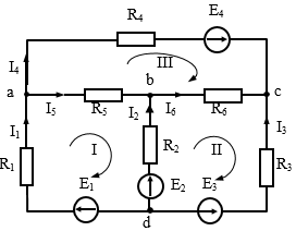 + Ký hiệu các nút a,b,c,d, chọn ba nút độc lập là a,b,c và ba vòng độc lập I, II, III. Chiều dòng điện các nhánh và chiều các vòng được chọn như hình vẽ.