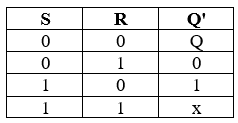 Bảng chân lý của RS–FF được cho ở dưới. Trong bảng này khi đầu vào Set có mức 1 thì đầu ra Q sẽ lên 1 dù giá trị trước đó là 0 hay 1 tùy ý. Tương tự đầu ra Q sẽ có mức 0 khi Reset có mức 1. Khi cả hai đầu vào Set và Reset có mức logic 0 thì đầu ra Q không thay đổi giá trị.
