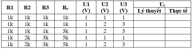 Bước 3: Thiết lập các giá trị R1 , R2 , R3 , Rn của mạch cộng đảo hoàn thành bảng giá trị sau: