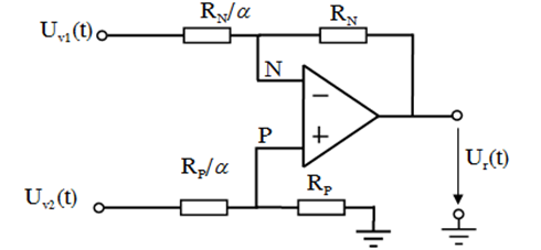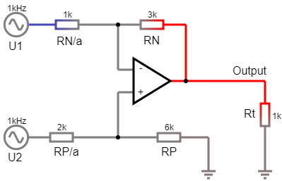 Giả sử bộ khuếch đại thuật toán là lý tưởng, có tín hiệu đặt vào cửa vào đảo và cửa vào không đảo là: Uv1(t), Uv2(t). Với điện trở tại đầu vào đảo và không đảo là: RN/a, RP/a. Khi đó điện áp ra là: Ur = a(Uv2(t) - Uv1(t)). Với a là hệ số tuỳ chọn.